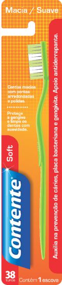 Cabo com formato anatômico em polipropileno. Cabeça com 38 tufos de cerdas em nylon. Cerdas bicolores, que indicam a hora da troca. Apoio antiderrapante, para maior controle e segurança durante a escovação. Cerdas com pontas arredondadas e polidas que protegem a gengiva e o esmalte dos dentes. Auxilia na prevenção de cáries, placa bacteriana e gengivite.